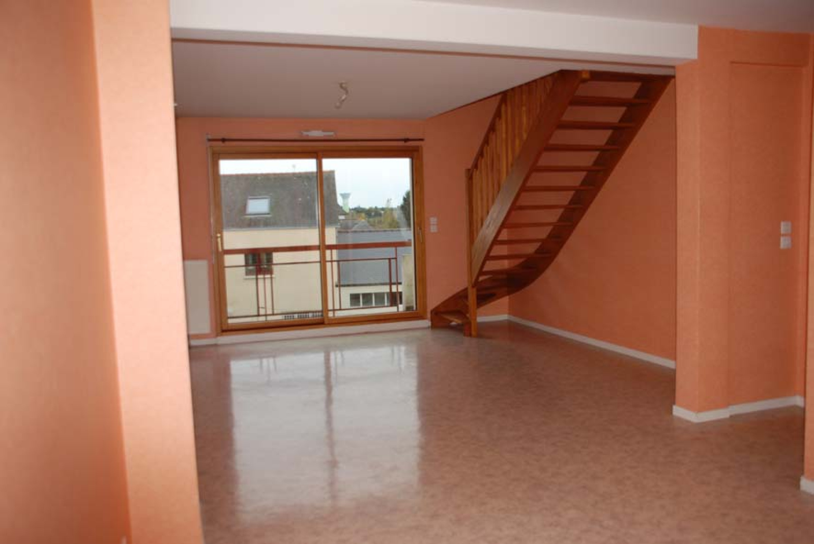 MONTAUBAN DE BRETAGNE: Centre ville un appartement au 2ième étage, en duplex comprenant, une entrée, une cuisine ouverte sur séjour avec balcon , office. A l'étage deux chambres, une salle de douches; Garage.